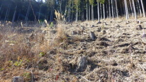 ひと昔前は、伐採後に放っておけば自然に森に返りましたが、鹿の生育数が多い現在では伐採後に生えてくる草木が鹿にことごとく食べられてしまうため、なかなか森にまではなってはくれません。それどころか、場合によっては草も生えずに表土がむき出しになって土砂崩れを招いてしまいます。